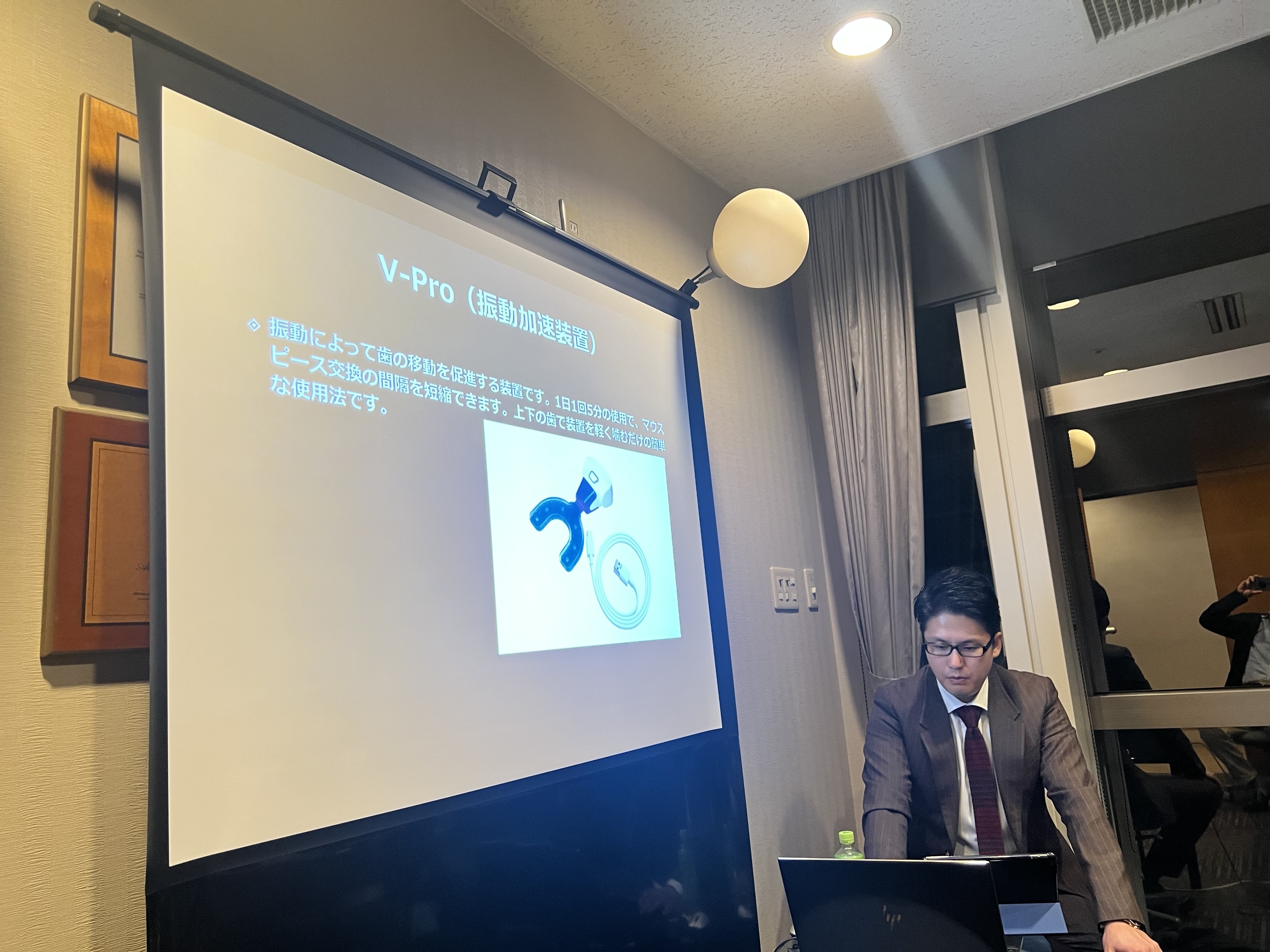多数の症例を提示してのご講演はとても興味深く、参加者は熱心に耳を傾けていた。講演では、矯正治療後の顔貌も見せることができるInvisalign Outcome Simulator Proや歯の移動を振動によって促進する装置であるV-Proについても説明されていた
